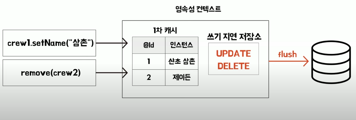 엔티티 인스턴스에 대한 쿼리를 바로 DB로 보내지 않고 1차 캐시에만 반영하고, 쿼리는 쓰기 지연 저장소에 쌓아둔다. 이렇게 되면 '1차 캐시-DB' 간의 불일치가 발생하는데, 이를 동기화(flush) 시켜줄 때 모아두었던 쿼리를 한번에 DB로 보낸다.