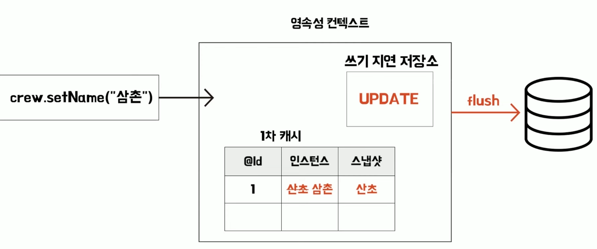 자동으로 변경을 감지해주는 것 JPA는 엔티티가 영속성 컨텍스트에 처음 들어올때 그 상태를 복사해 저장한다.(스냅샷) flush를 하기 전, 스냅샷과 현재 상태를 비교해서 UPDATE 쿼리를 쓰기 지연 저장소에 추가한다.